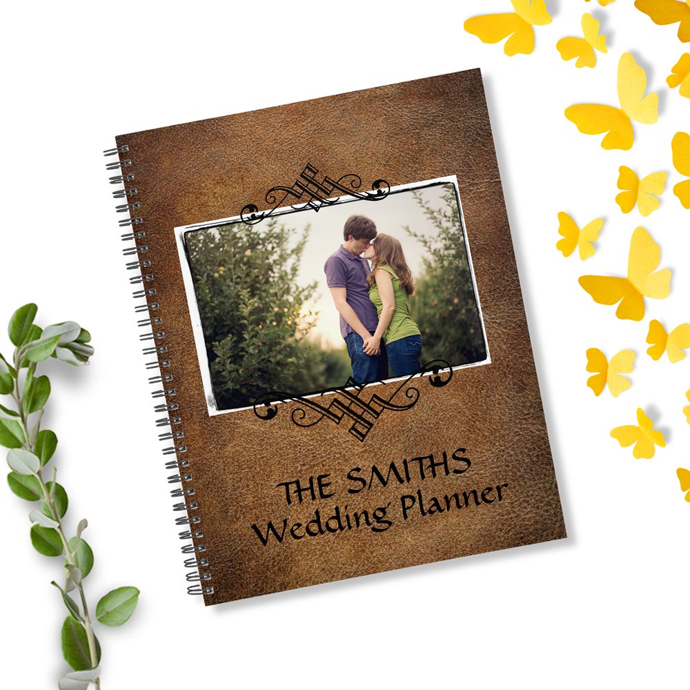 Plan your wedding with this rustic, brown, faux leather cover with photo template on front with custom text too. Black, elegant filigree scrolls will accent your photo.