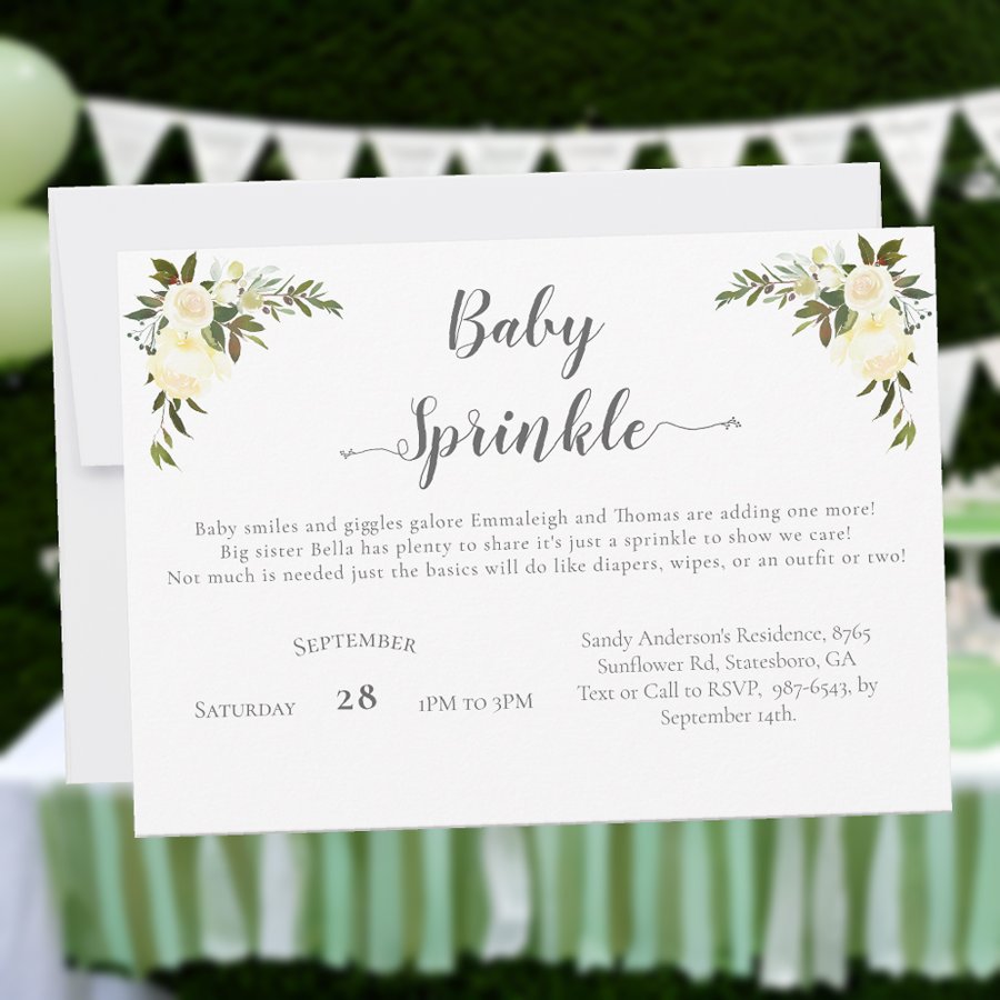 Invite your guests to a luxurious, white rose floral baby sprinkle shower. Bouquets in each top corner surround "Baby Sprinkle". Poem is for you to personalize as well as templates. If you wish to view the matching collection it's at the tab at top of page, and if you need anything you don't see, please let me know. I'm happy to help. #babysprinkle